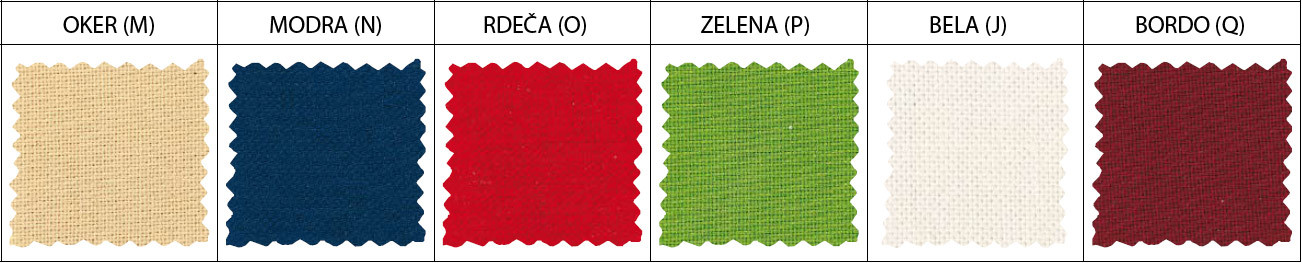 Bela, bež, rjava, rdeča, modra, zelena.