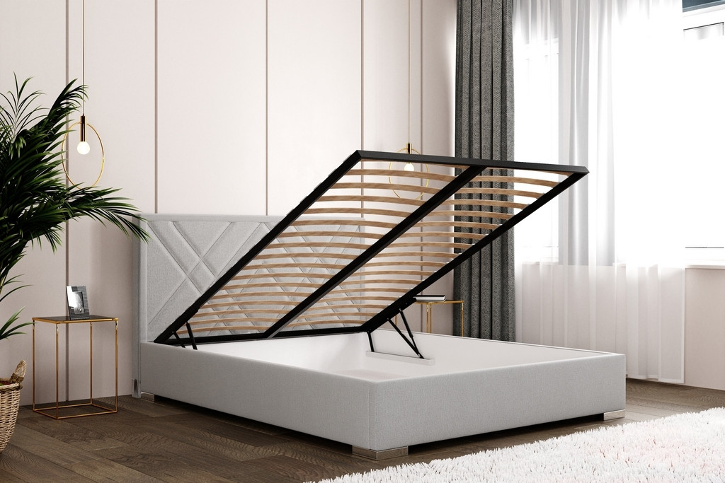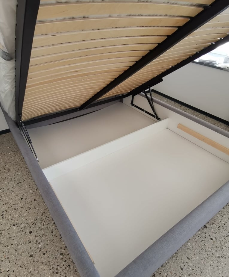 Oblazinjena postelja TREMONT ima dvižni mehanizem, ki se z lahkoto uporablja in vam nudi izkoristek celotnega prostora pod posteljo za shranjevanje posteljnine, letnih oblačil, vzglavnikov in odej ter ostalih poljubnih predmetov. Vaše omare bodo zato ostale lepo urejene in ne bodo prenatrpane. Predal pod posteljo je razdeljen na dva dela in je visok približno 14 cm.