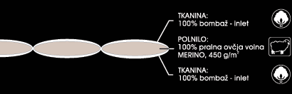 Polnino: 100% pralna ovčja volna MERINO kvalitete, 450 g/m2. Ovčja volna je naravni material s specifičnim vonjem. Idealna je za vse, ki imajo radi toploto, so podvrženi znojenju in niso alergični na naravna vlakna. Specialna ovčja volna MERINO Woolmark kvalitete je pralna.
