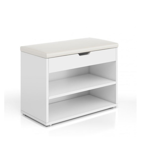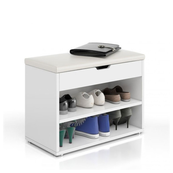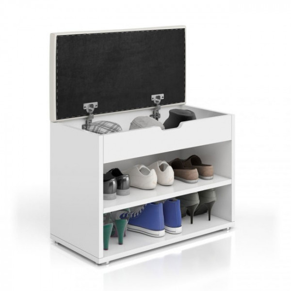 Omara za čevlje VALLEY je praktična omara za čevlje, ki jo ob enem lahko uporabljate tudi kot klop. Omara je dobavljiva v beli barvi. Narejena iz kvalitetnega MDF materiala. Zgornji del omare je oblazinjen z belim umetnim PU usnjem. Omarica ima zgoraj zaboj, pod njem pa sta dve polici, kjer lahko odložite čevlje ali druge predmete.