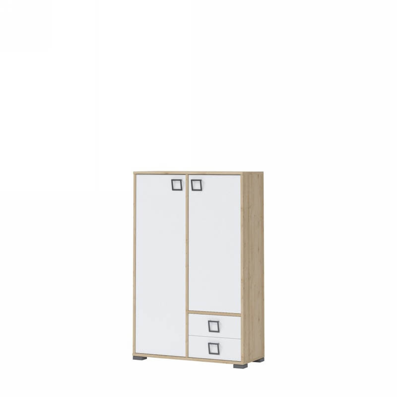 Otroška komoda Kiki je na voljo v 4ih različnih barvnih kombinacijah zato si lahko izberete poljubne barve in si komodo prilagodite svojim željam in potrebam. Dele komode si lahko razporedite po želji, komoda ima lahko štiri različne izglede. Predala sta lahko zgoraj ali spodaj in levo ali desno, potem pa preprosto še vstavite večja in manjša vratca na pripadajoči mesti. Je zelo praktična in dobro konstruirana komoda saj ima kar sedem polic in dva predala, zato bodo vaše dragocenosti vedno dobro pospravljene in organizirane. Izdelana je iz oplemenitene iverne plošče.