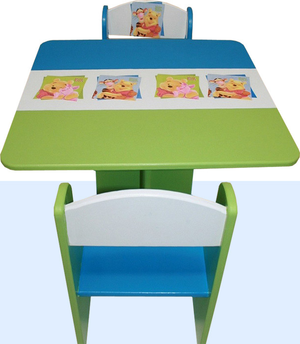 Otroška mizica in stolčka Medvedek Pu (zelena-modra) je unikaten komplet, narejen s servietno tehniko z motivom otrokovega najljubšega pravljičnega junaka. Izbirate lahko med manjšim ali večjim kompletom otroške mizice in stolčkov. Manjši komplet je priporočljiv za otroke do 4 leta, večji pa za otroke do 10 leta starosti. Otroška mizica je na voljo v kvadratni obliki ali z zaokroženimi robovi.