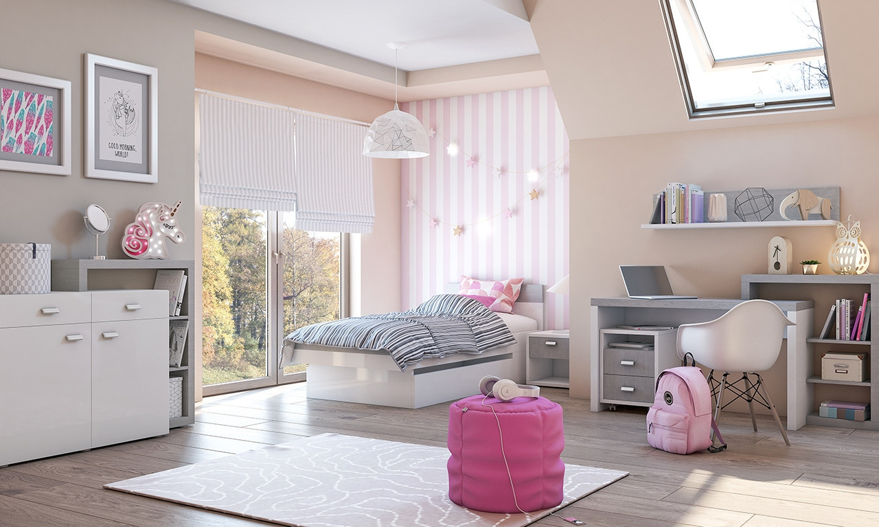 Elegantna kombinacija bele barve in betona je primerna tako za fantke kot za punčke, saj je nevtralna in se odlično poda tako z dekliškimi kot s fantovskimi barvami. Sobici lahko otrok doda svoj pečat z bolj barvitimi stenami, slikami, preprogo in posteljnino.