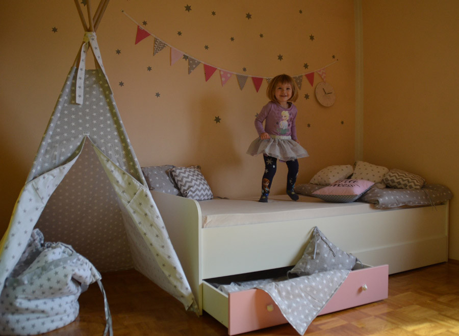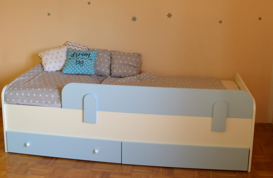 Pri otroški postelji Medvedek 2 poleg niso vključeni predali. Možno je tudi naročilo posteljice Medvedek 3 (z varovalom in predalom) ali posteljice Medvedek 1 (brez varovala in predala).