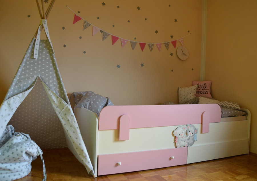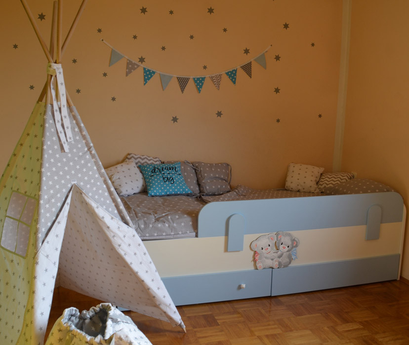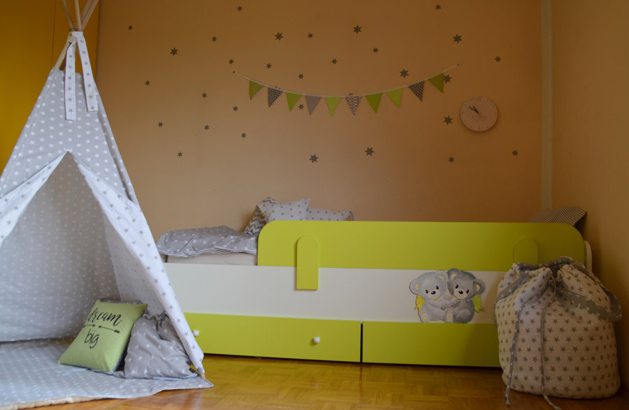 Otroška postelja Medvedek 2 je izjemno kompaktna in kvalitetna postelja, ki je primerna tako za vaše malčke, kot za najstnike. Na voljo je v dimenziji 90x200 cm v beli barvi in z univerzalnim motivom medvedkov, ki je ročno narisan in snemljiv. Postelja je izdelana iz iverne plošče, letvice pa so iz masivnega lesa. Z enim samim potegom snemljivo varovalo lahko pomikate po stranici postelje in s tem povečate varnost za vašega otroka. Varovalo je na voljo v bež, roza, modri ali zeleni barvi.