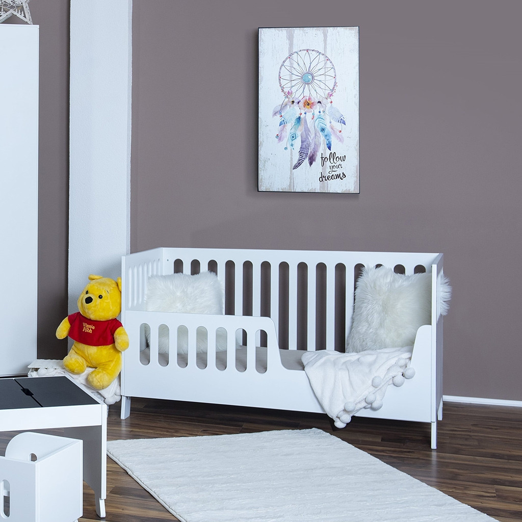 Privoščite svojemu otroku ljubko posteljico KATLIN, ki raste skupaj z njim! Visoka ograjica je namenjena za naše najmlajše, ko otrok nekoliko zraste pa jo lahko zamenjate z nekoliko nižjo ograjico. Posteljica je na voljo v treh različnih barvah in izdelana iz kvalietnih MDF plošč, ki omogočijo kvalietno posteljo za miren in varen spanec.