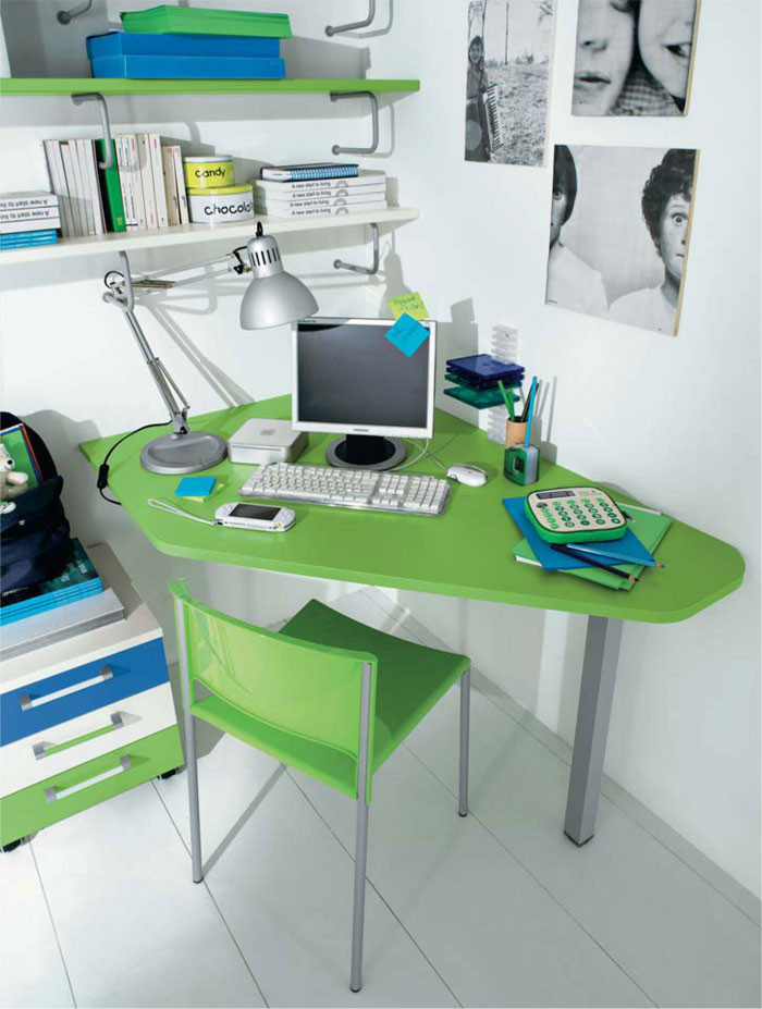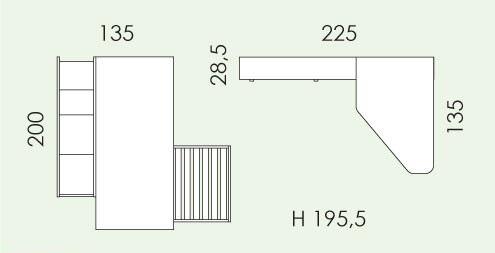 Zadaj, za zadnjo stranico konstrukcije so postavljene stopnice, ki omogočajo lahek dostop do postelje, obenem pa so zelo funkcionalne saj so v njih predali(4). Sobo zaokrožuje kompozicija polic ter pisalna miza Poli L s stolom. Vsi ti elementi omogočajo, kar najboljšo izrabo prostora.