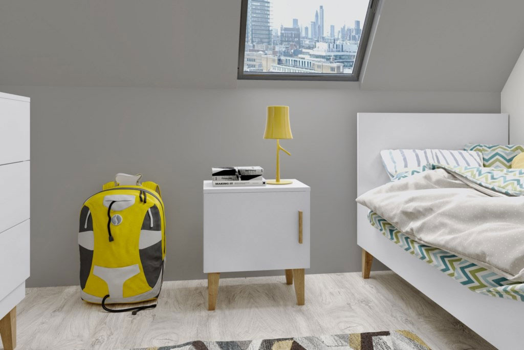 Otroška soba KELLY je sestavljena iz 4ih funkcionalnih elementov, ki ne zavzamejo veliko prostora in nudijo otroku vse kar potrebuje za odlično vzdušje za učenje, spanje in preživljanje prostega časa. V ponudbo je vključena postelja s posteljnim podom, nočna omarica, predalnik in garderobna omara, tako da bo otrok imel obilo prostora za shranjevanje oblačil in igrač.