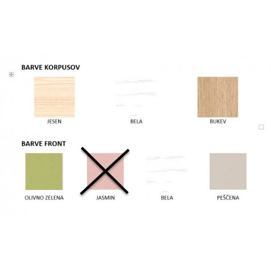 Otroška soba KIKI 1 je na voljo v 9ih različnih barvnih kombinacijah! Izbirate lahko med tremi barvami korpusov in štirimi barvami front zato boste zagotovo našli vsaj eno, ki vam bo ugajala. Je praktična in funkcionalna otroška soba, kjer bo vaš otrok z veseljem preživljal prosti čas. Omare imajo funkcijo tihega zapiranja. Izdelana je iz oplemenitene iverne plošče. Elemente si lahko razporedite po želji.