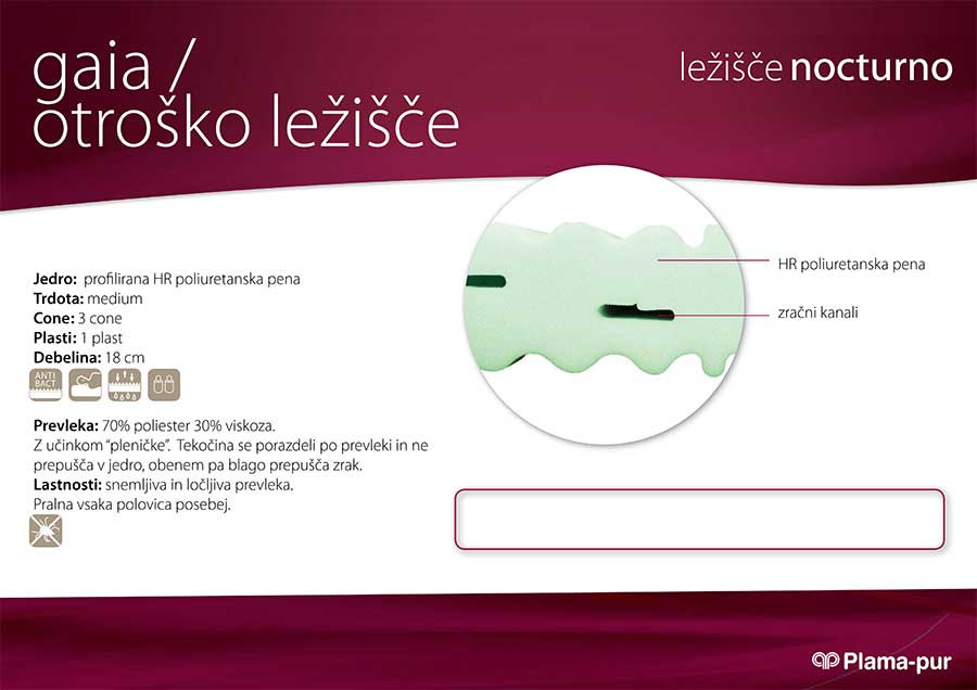 Otroško ležišče Gaia je kakovostno ležišče nerejeno iz profilirane HR poliuretanske pene, ki ga izdeluje priznano slovensko podjetje Plama-pur. Ležišče je ergonomsko. Ima 3 cone kar pomeni, da se ležišče prilagaja krivulji hrbtenice in ji nudi podporo na mestih kjer jo ta potrebuje, s tem pa omogoča prijetno in mirno spanje otroka.
