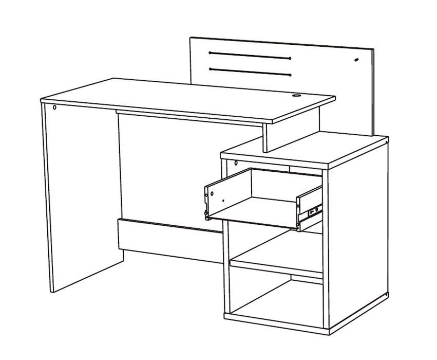 Pisalna miza je izdelana iz oplemenitene iverne plošče, ima kovinske ročaje, en predal in dve polički.