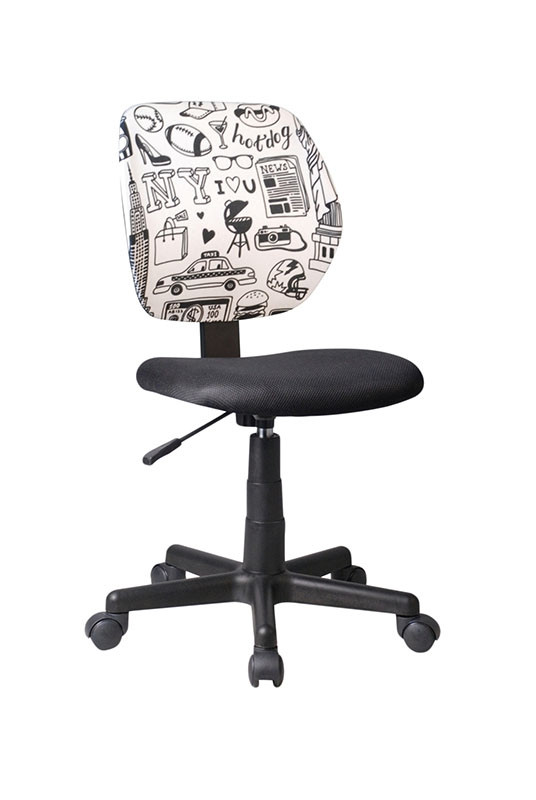 Pisarniški stol ARIEL je otroški pisarniški stol s črnim sediščem in naslonom s potiskom. Oblazinjen je s kvalitetno tkanino, ki omogoča udobje ter moderni izgled. Plastično podnožje je v črni barvi. Je vrtljiv in nastavljiv po višini, tako da ga z lahkoto prilagodite lastnim potrebam. Maksimalna obremenitev je 80 kg, hrbtišče je iz mrežice in ni oblazinjeno.