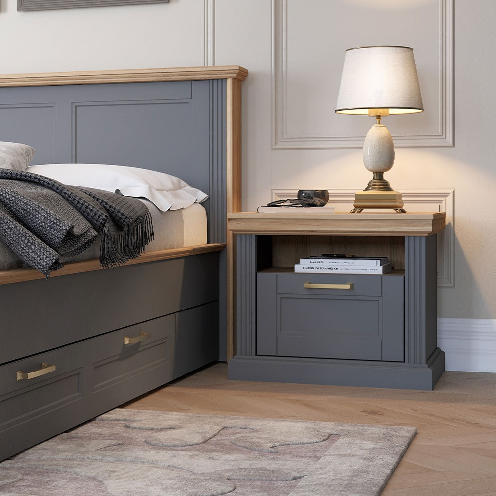 Spalnica KALLA TARA ima brezčasen dizajn v kombinaciji grafita in oreha, ki omogočata eleganten videz spalnice in prijeten ambient za spanje in sproščanje. V spalnici KALLA TARA se boste zato vedno odlično počutili!