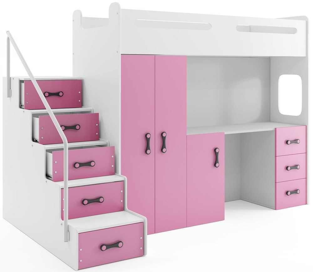Pograd Max je sestavljen iz kar osmih elementov, ki nudijo vašemu otroku vse kar potrebuje za praktično in funkcionalno otroško sobo. Garderobna omara, predalnik, manjša omarica pri pisalni mizi ter predali na stopnicah poskrbijo za to, da ima vaš otrok obilo prostora za shranjevanje najrazličnejših predmetov, zato pa bo tudi soba vedno ostala organizirana in lepo pospravljena.