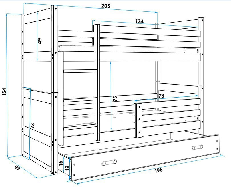 Otroški pograd RICO zgotavlja izjemno kakovost. Pograd RICO je oblikovan predvsem zato, da lahko svojim otrokom ustvarite varno in ljubko sobico, za kar vam ne bo potrebno odšteti celega bogastva. V kakovost same postelje vas bo prepričala uporaba naravnega lesa ter visoko kakovostnih plošč MDF. Konstrukcija vseh otroških postelj pa je povezana z zelo močnimi in trdnimi vijaki.
