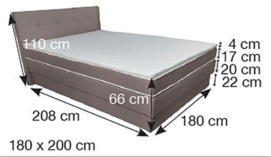 Pri dimenziji 180x200 je postelja sestavljena iz: 2x 200x90cm zaboja in 2x vzmetnica 90x200cm ali 1x vzmetnica 180x200cm (če je vzmetnica 180x200cm je uporaba zaboja otežena!)