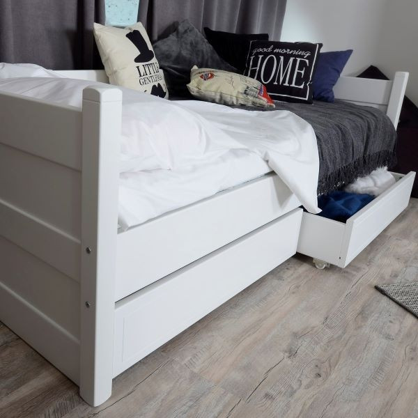 Klasična postelja METI se ponaša s kvalitetno izdelavo in brezčasnim videzom. Izdelana je iz kombinacije masivne bukve in kvalitetnih MDF plošč, podposteljna predala pa imata mehko zapiranje, ki omogoča lažjo vsakodnevno uporabo in prepreči nastajanje poškodb. Na voljo je v beli barvi, katero z lahkoto kombinirate s katerokoli drugo barvo.