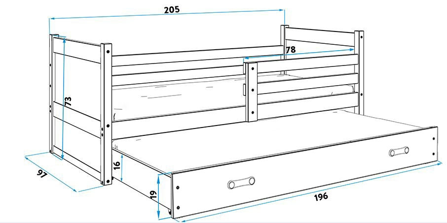 • Postelja: 73x205x97cm (VxDxŠ) – za vzmetnico 200x90