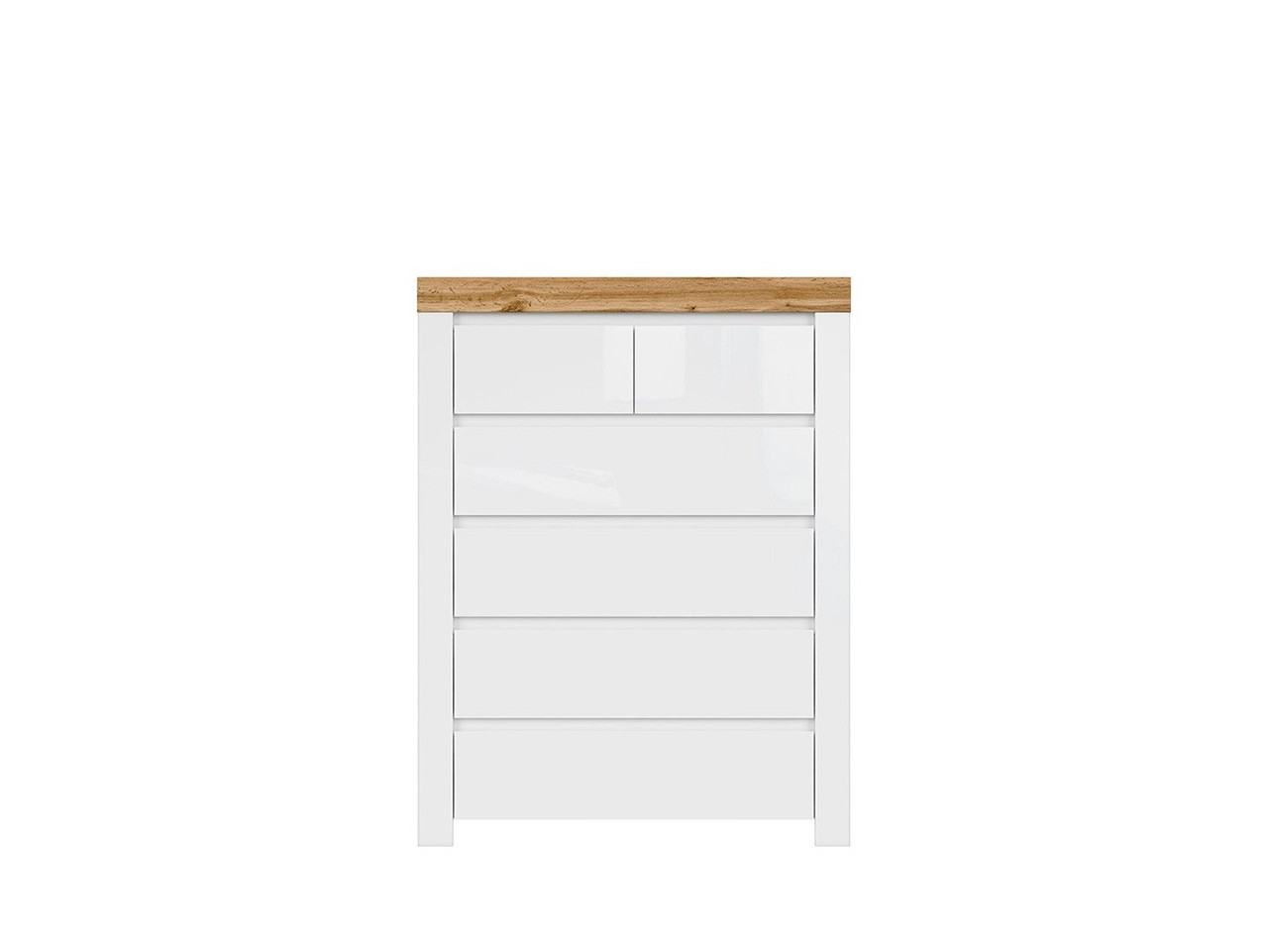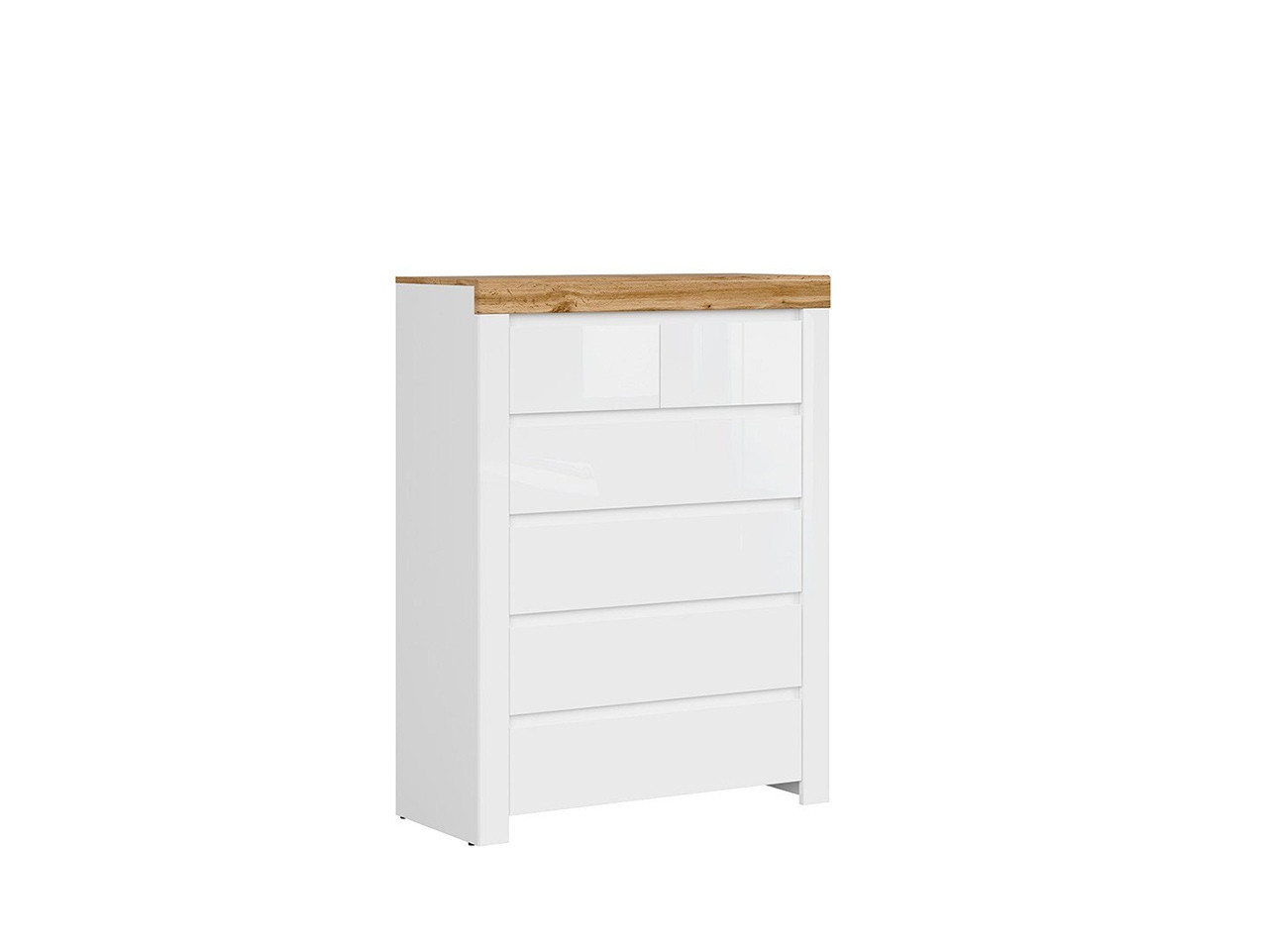 Opremite svojo spalnico s prostornim predalnikom NOEL, ki je sestavljen iz štirih velikih in dveh manjših predalov, kamor lahko pospravite obilo oblačil in modnih dodatkov. Predali imajo funkcijo tihega zapiranja, ki omogoča lažjo vsakodnevno uporabo in preprečuje nastajanje prask in poškodb. Predalnik je na voljo v moderni kombinaciji hrasta in bele barve v visokem sijaju, ki posvetli in optično poveča prostor.