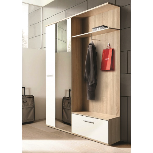 Predsoba Brindisi Plus je sodoben komplet elementov za predsobo v kombinaciji barve oreha in bele barve visokega sijaja. Predsobo sestavljajo omara, komoda s stekleno polico na vrhu, ogledalo ter obešalnik.