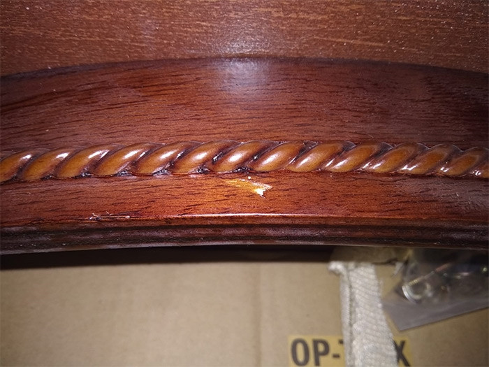 Miza ima manjšo poškodbo na plošči, ki je nastala od transporta. Slika poškodbe v galeriji.