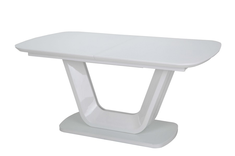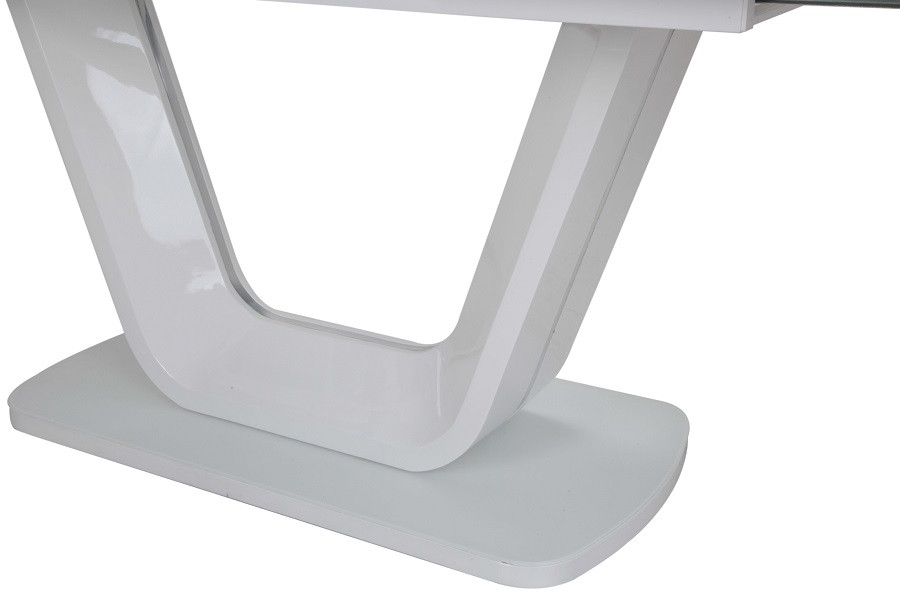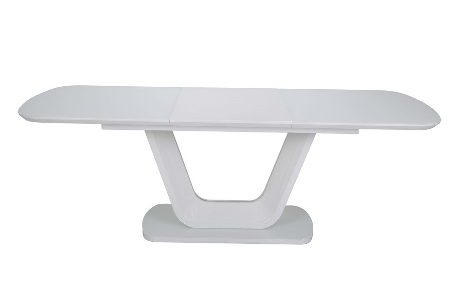 Raztegljiva jedilna miza VILMER je v beli barvi. Plošča mize ima imitacijo belega mat stekla, narejena je iz MDF materiala. Sredinska plošča ter steber sta v visokem sijaju. Raztegljivi del je enostaven za odpiranje. Spodnja plošča je iz MDF materiala in ima belo mat steklo.