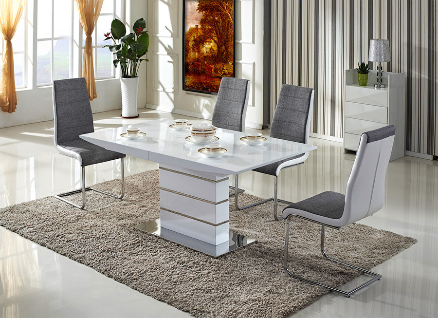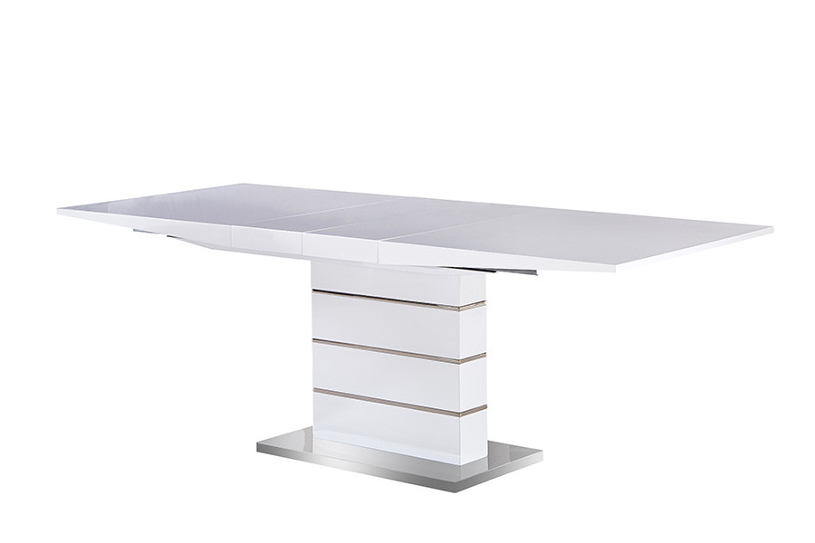 Raztegljiva miza KITI je jedilna miza narejena iz MDF materiala z sredinskim raztegom. Mizna plošča je v belem visokem sijaju. Podnožje je kovinsko.