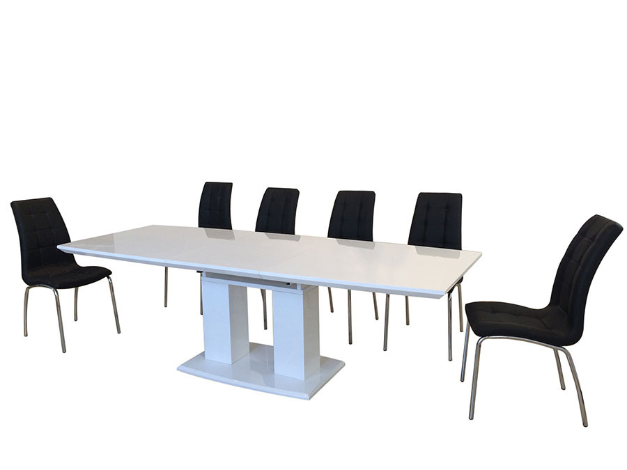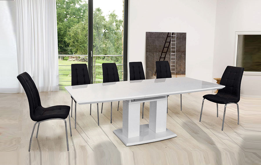 Raztegljiva miza KLEIN je raztegljiva jedilna miza v dveh različnih dimenzijah. Narejena je iz MDF materiala v visokem sijaju.