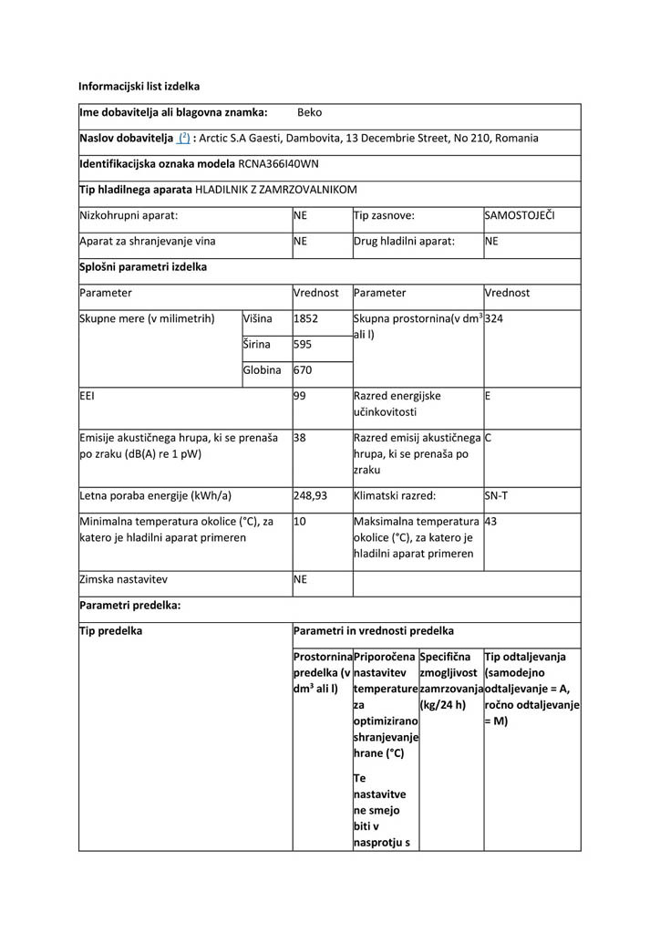 Kombinirani hladilnik Beko RCNA366I40WN z zamrzovalnikom spodaj navdušuje s tehnologijo NeoFrost, ki pripomore k 2x hitrejšemu hlajenju, tehnologijo No Frost – samodejnim odtaljevanjem in predalom za daljšo svežino, zamrzovalni predel ima 3 prostorne predale. Zaradi posebnih tečajev pa se vrata odpirajo vzporedno s stransko stranico hladilnika. Možnost zamenjave strani odpiranja vrat omogoča prilagajanje vsakemu prostoru. Kombinirani hladilnik se nahaja v energetskem razredu E, glasnost njegovega delovanja pa znaša 38 dB.