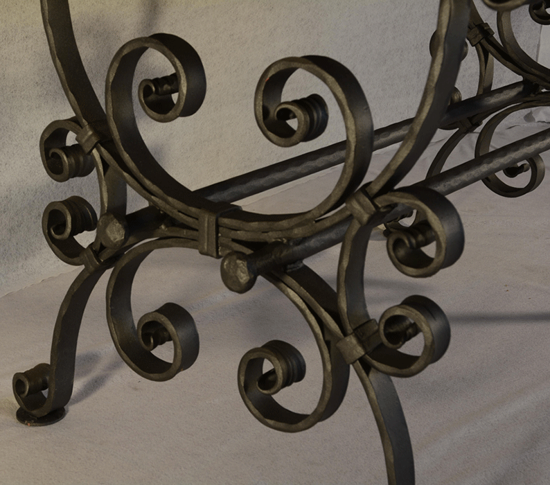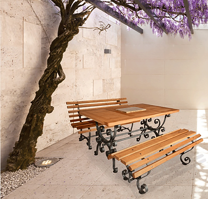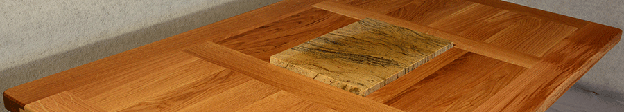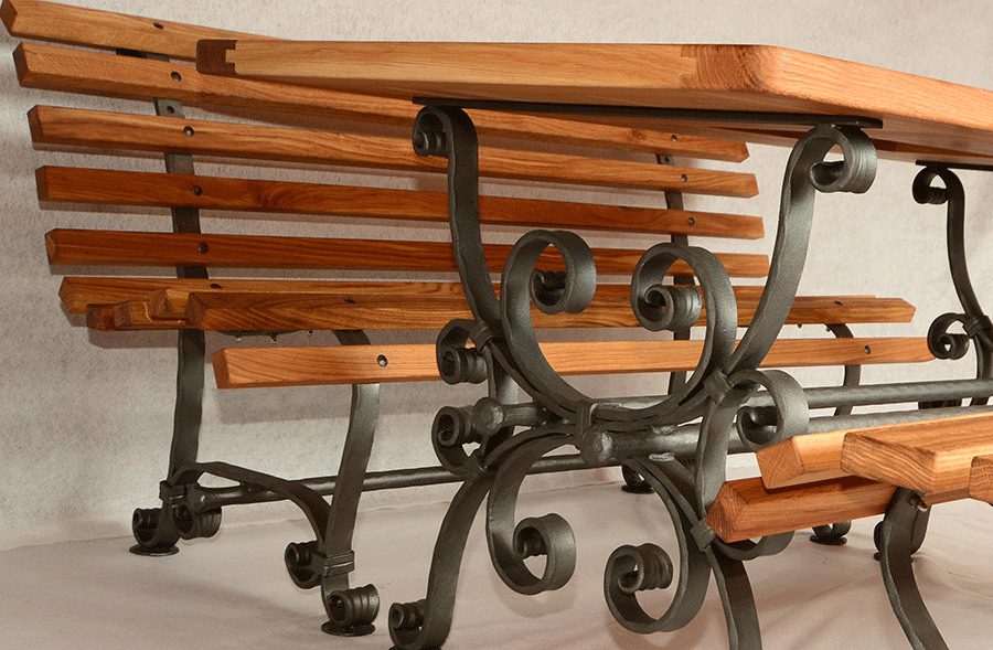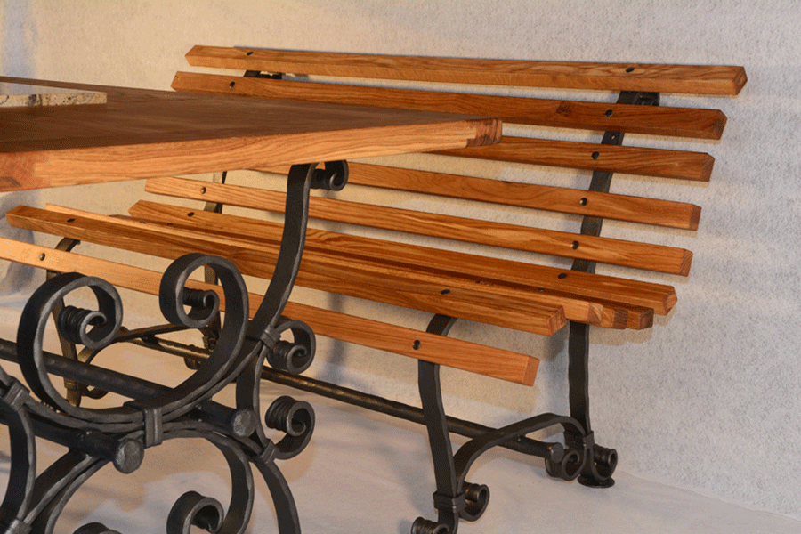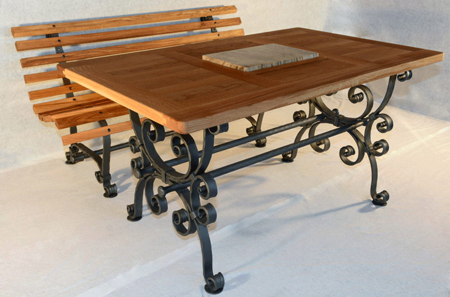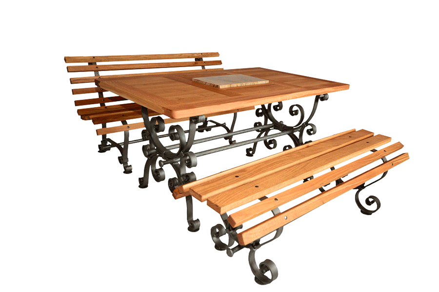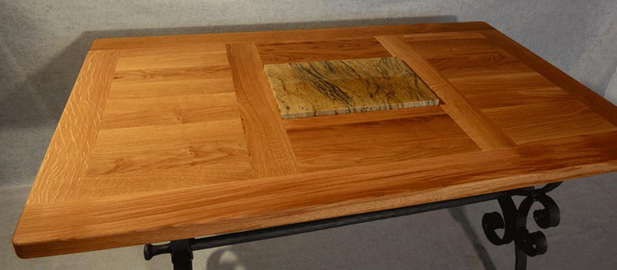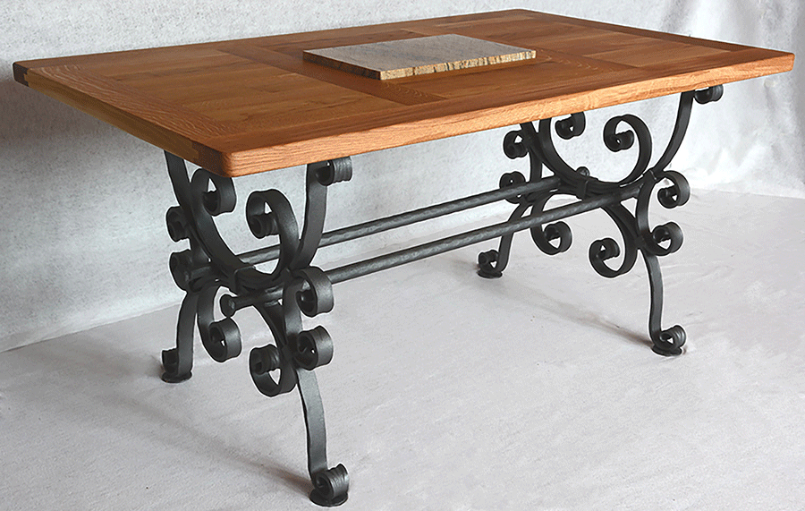 Ročno kovana miza s hrastovo ploščo in kanitim vstavkom 150×90 cm je mogočna ročno kovana miza blagovne znamke Private Joy Space v obliki okvirja lepljeno masivno hrastovo ploščo pravokotne oblike, dimenzije 150 x 90cm. S svojo podobo domačnosti nas vrača v prelepe spomine preteklosti. Leseno površino lično krasi sredinsko vzdolžno postavljena, nekoliko privzdignjena kamnita plošča, ki služi kot odlagalna površina vročih posod. Ogrodje mize je ročno kovano in vroče cinkano ter barvano v grafitno sivih tonih. Zaradi zaščite proti rjavenju kovanega ogrodja in oljnega premaza lesenih hrastovih površin, predstavlja prelep kos pohištva vaše kuhinje, jedilnice ali izbe, primerna pa je tudi za postavitev na prosto.