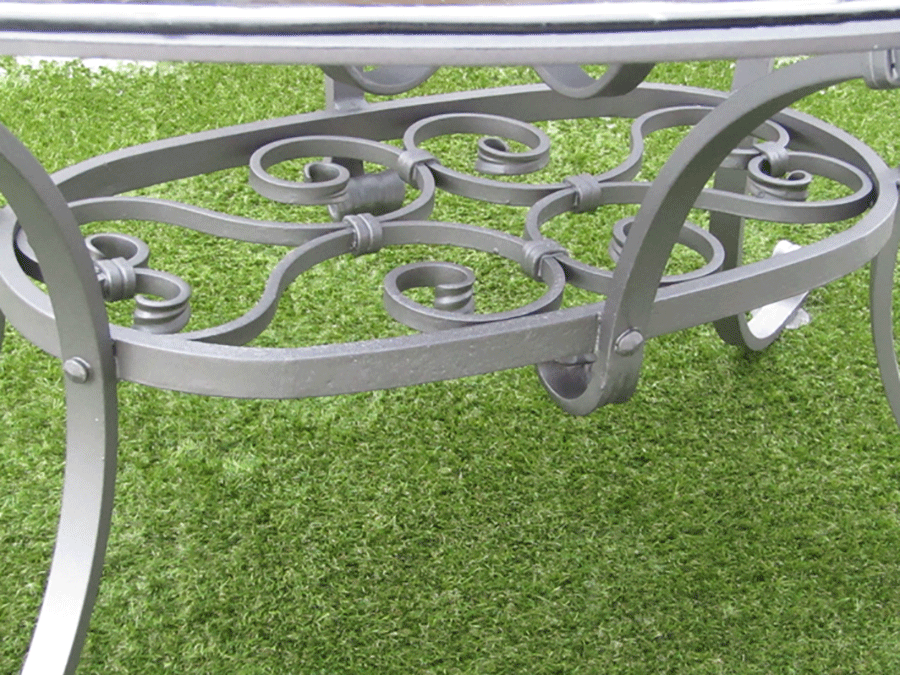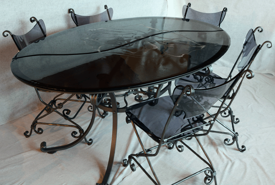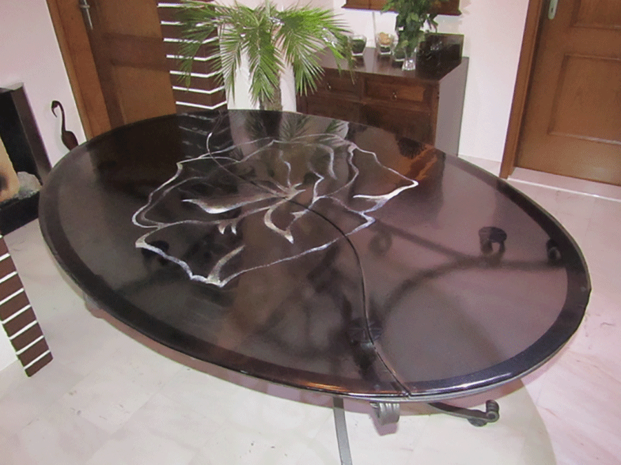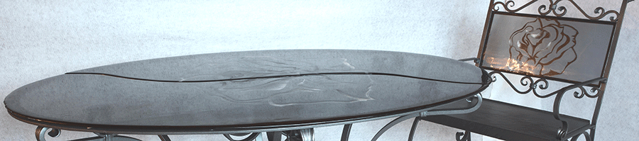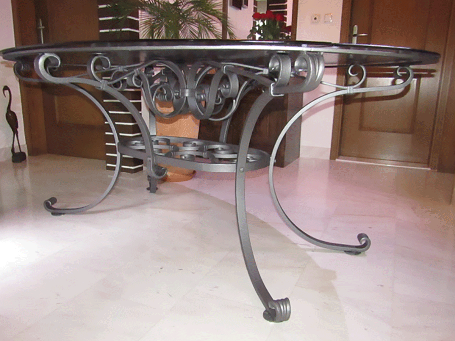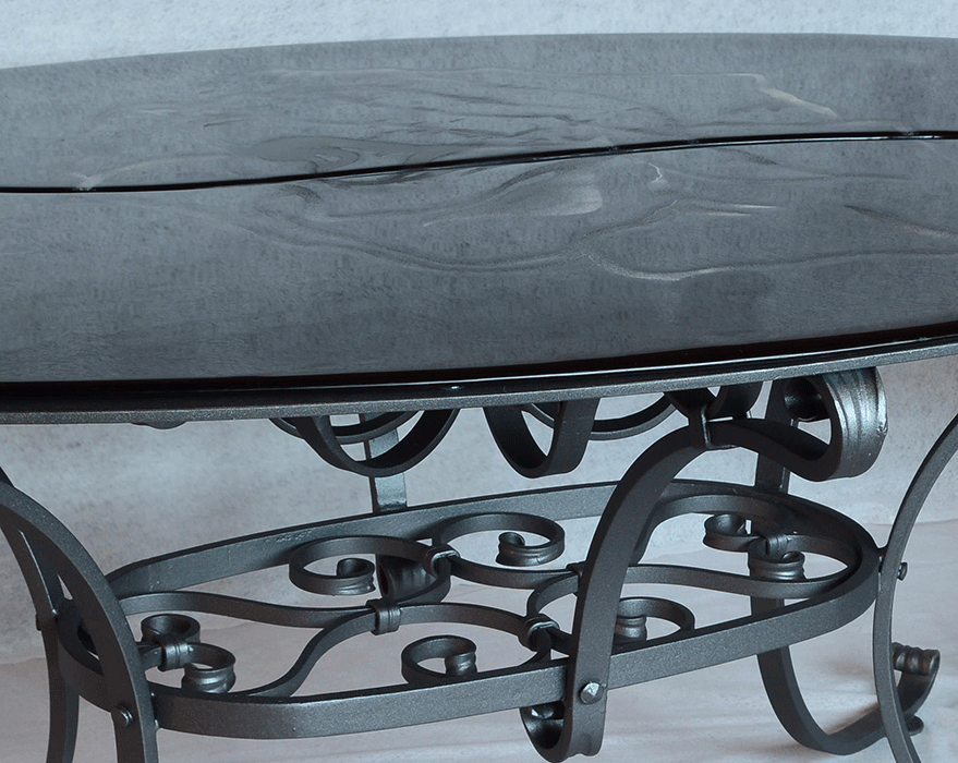 Ročno kovana ovalna miza s steklom 180×120 cm je ročno kovana v priznani slovenski kovačiji s 300 letno tradicijo. Miza je blagovne znamke Private Joy Space. Protikorozijsko je zaščitena, saj je obdelana s postopkom vročega cinkanja ter barvana s temeljnim nanosom. Za končno podobo poskrbi dvokomponentni nanos v grafitno sivem tonu. Tovrstna zaščita zagotavlja dolgoletno uporabo brez posebnega vzdrževanja, kljubuje pa tudi neugodnim vremenskih razmeram obmorskih krajev. Površino mize krasi kaljeno steklo debeline 8 mm, po želji okrašeno s črno – belo vrtnico, krivuljno razdeljeno na dve polovici.