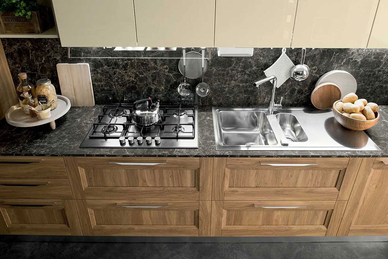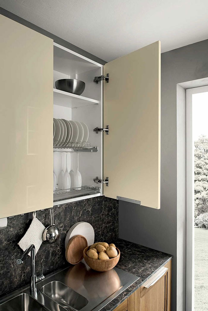 Kuhinja RIVIERA je sestavljena iz številnih različnih elementov, ki vam nudijo obilo prostora za shranjevanje hrane, posode, kozarcev in vseh ostalih kuhinjskih pripomočkov. Kuhinjski pult vam nudi obilo delovne površine na katero lahko odložite aparat za kavo, toaster, grelnik vode in obilo drugih aparatov.