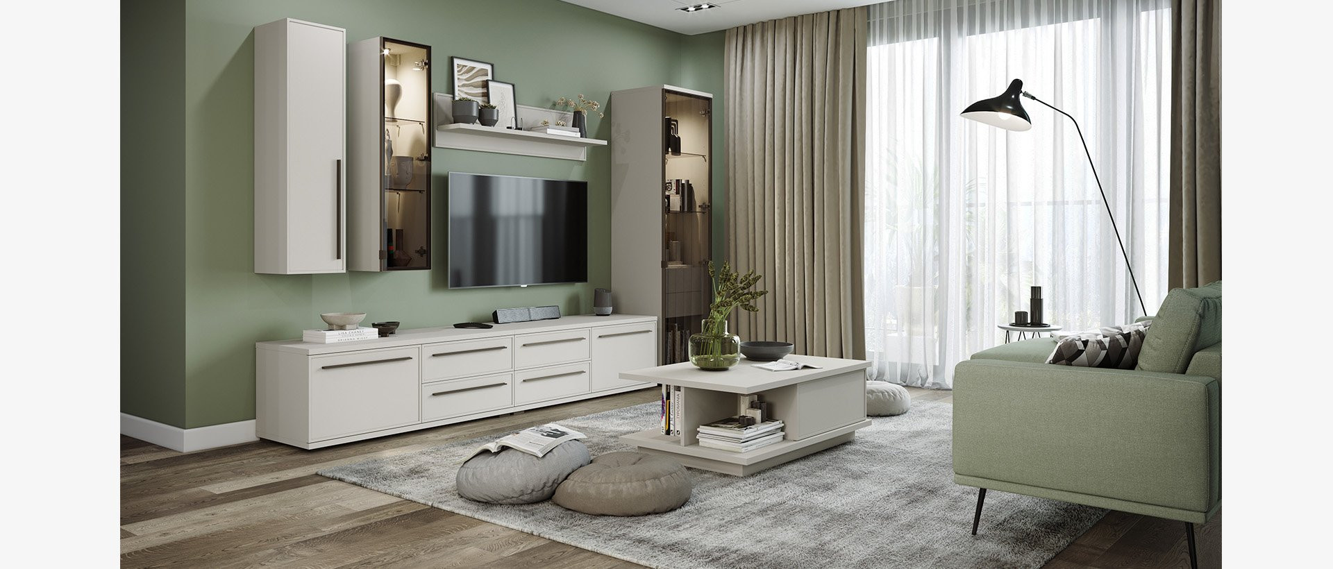 Dnevna soba Radda Opera 101 je popolna izbira za vse, ki cenijo prefinjen dizajn, vrhunsko funkcionalnost in brezčasno estetiko. Ta sodobno zasnovan sestav vključuje različne viseče omarice, elegantno stekleno vitrino, prostorno TV omarico ter klubsko mizico, vse v nežnem odtenku kašmir. Kakovostni materiali, kot je Egger univer, v kombinaciji z aluminijastimi okvirji in parsol steklom, ustvarjajo ekskluziven videz, medtem ko mehko zapiranje in masivna konstrukcija zagotavljata dolgo življenjsko dobo in enostavno uporabo.