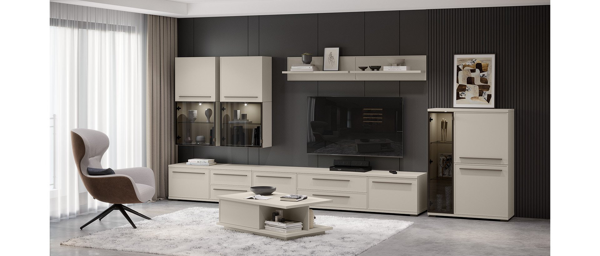 Dnevna soba Radda Opera 102 združuje sodoben dizajn, vrhunsko funkcionalnost in brezčasno estetiko. Ta premišljeno zasnovan sestav vključuje različne viseče omarice, elegantno stekleno vitrino, prostorno TV omarico in klubsko mizico, vse v prefinjenem odtenku kašmir. Kakovostni materiali, kot je Egger univer, v kombinaciji z aluminijastimi okvirji in parsol steklom, ustvarjajo luksuzen videz, medtem ko mehko zapiranje in robustna konstrukcija zagotavljata dolgotrajno vzdržljivost in enostavno uporabo.