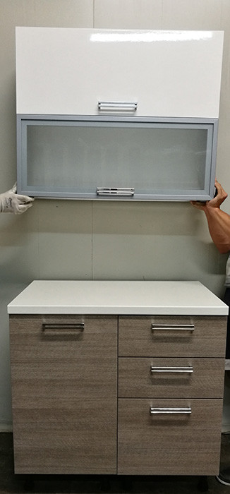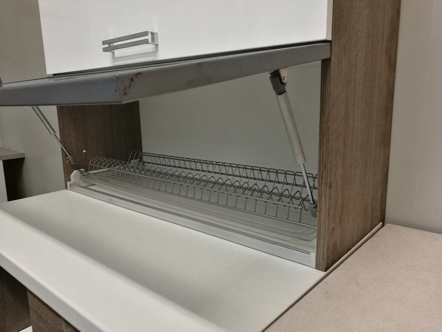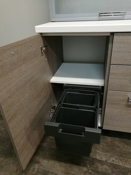 V spodnji omarici je koš za ločevanje smeti, v predalu pa je vgrajen razdelilnik za jedilni pribor. V zgornji omarici pa je kovinsko stojalo za krožnike.