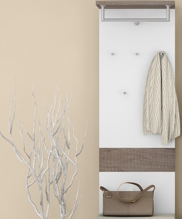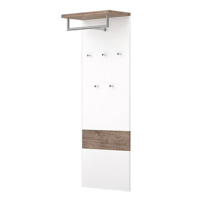 Stenski obešalnik je narejen iz oplemenitene iverne plošče (18 mm) v beli barvi. Leseni dodatki so v temni nebraska barvi. Robovi so ABS (mehki robovi).