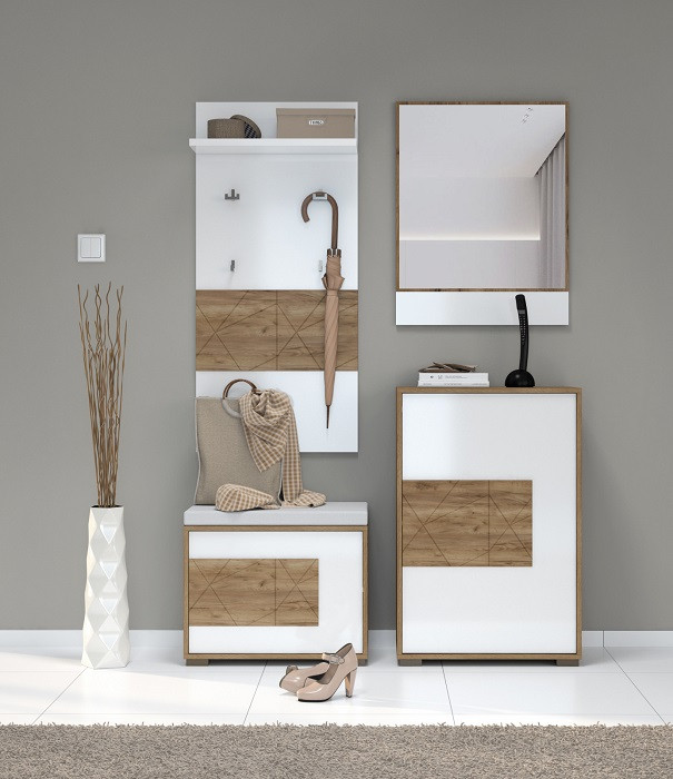 Stenski obešalnik je narejen iz oplemenitene iverne plošče (16 mm) v beli barvi visoki sijaj, ki je lakirana z UV lakom. Leseni dodatki v hrast barvi so narejeni iz MDF materiala. Robovi so ABS (mehki robovi).