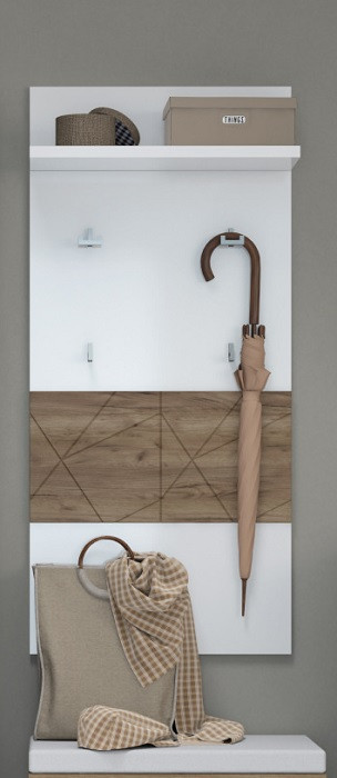 Stenski obešalnik je narejen iz oplemenitene iverne plošče (38 mm) v beli barvi visoki sijaj, ki je lakirana z UV lakom. Leseni dodatki v hrast barvi so narejeni iz MDF materiala. Robovi so ABS (mehki robovi).