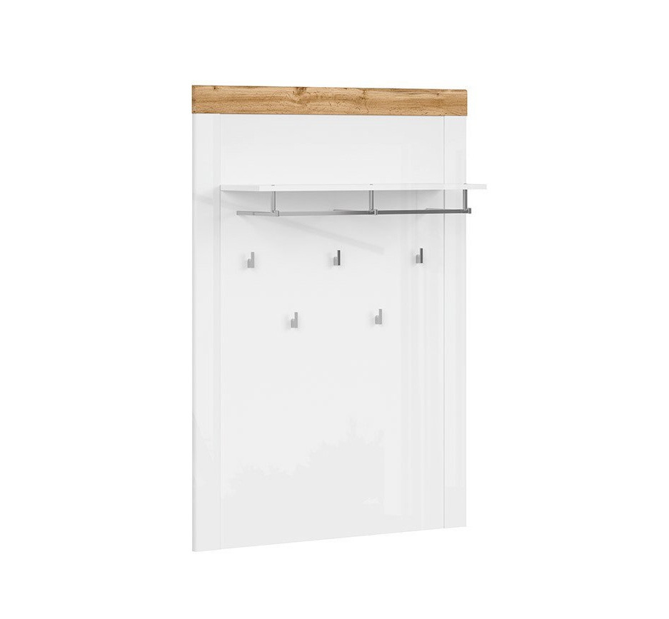 Stenski obešalnik NOEL je priročen pomagač za vaš hodnik ali predsobo. Ima poličko na katero lahko odložite kape in rokavice, ter 5 obešalnikov na katere lahko obesite šale in vrhnja oblačila. Na voljo je v elegantni barvni kombinaciji hrasta in bele barve v visokem sijaju, ki lepo izgleda v vsakem domu in se dobro poda z ostalimi barvami.