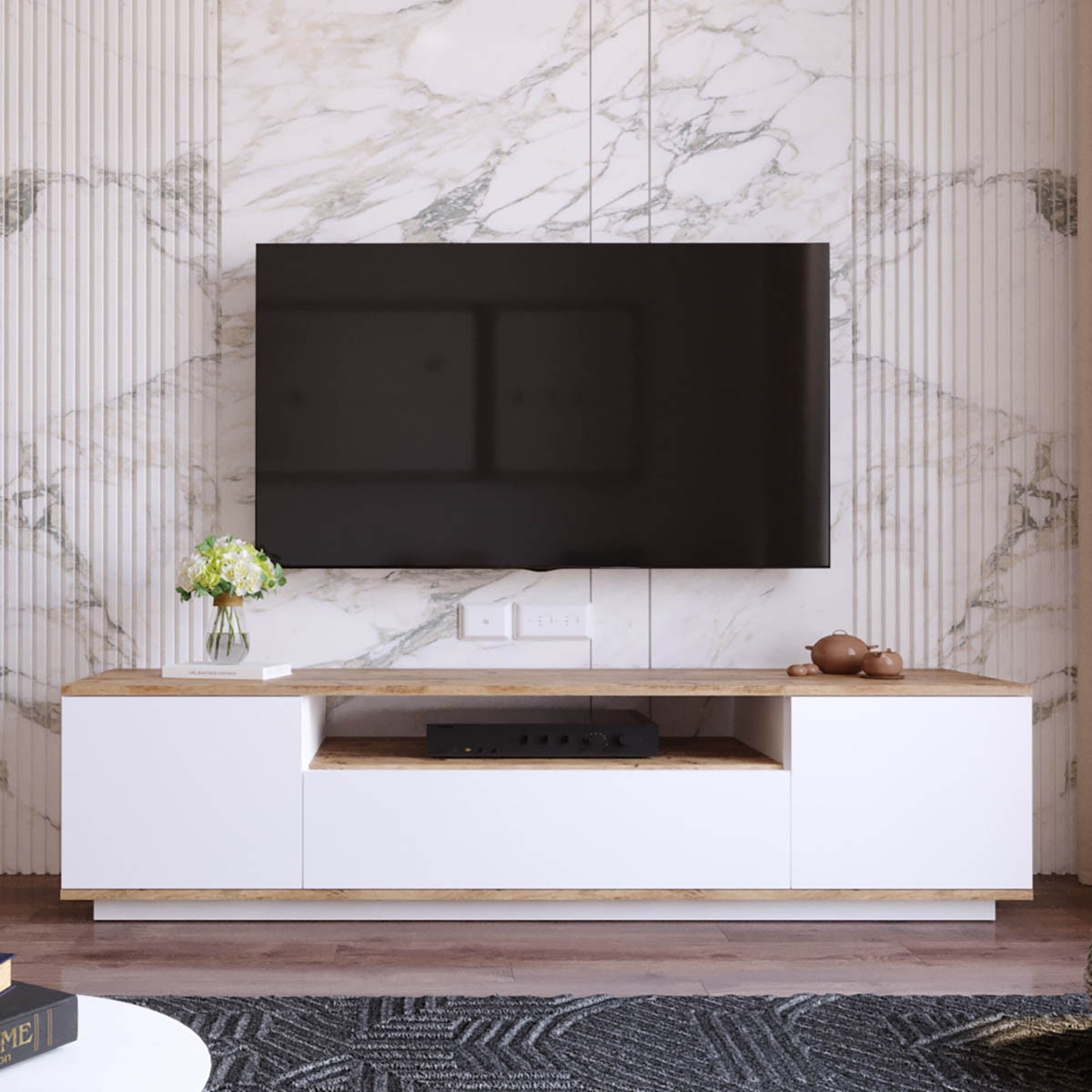Privoščite si nakup TV omarice LARSON, ki bo vaš dnevni prostor poživela in ga naredila privlačnejšega. Vsebuje vratca za katera lahko shranite vaše družabne igre in knjige, ter polico na katero lahko odložite dekorativne izdelke. Na voljo v kombinaciji elegantne bele barve in atlantskega bora.