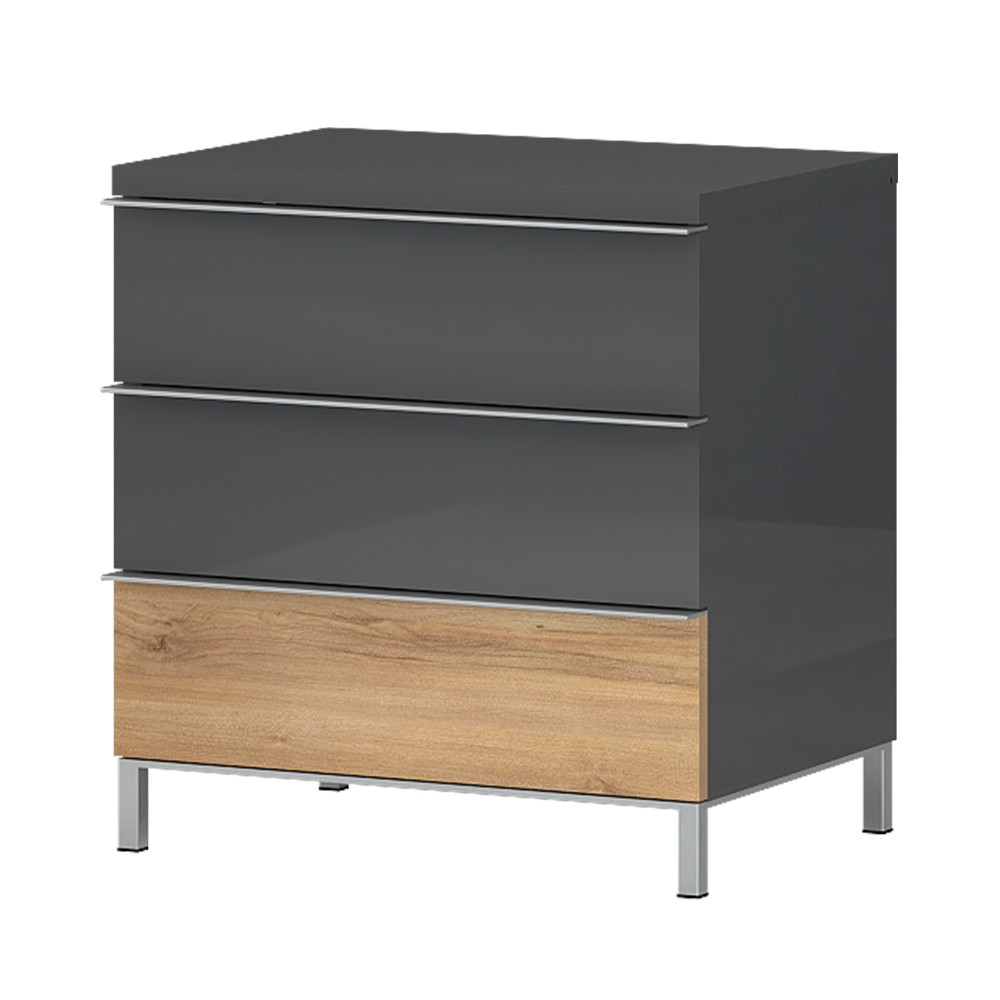 Nočna omarica KALLA ONYX ima tri predale s funkcijo tihega zapiranja ter odlagalno površino, na katero lahko odložite lučko, telefon in kozarec vode, v predala pa lahko pospravite predmete, katere želite imeti vedno pri roki. Na voljo je v moderni barvni kombinaciji pacifičnega oreha in antracita v visokem sijaju, ki nudi pohištvu bolj eleganten videz. Zunanji deli so premazani z UV lakom, ki je bolj odporen na vlago, praske in poškodbe kot standardni laki, zato bo vaše pohištvo dlje časa lepo ohranjeno!