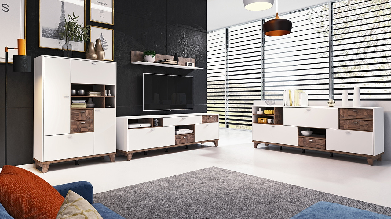 Kolekcija OSLO se odlikuje po velikem številu manjših omaric, predalov in polic, ki vam olajšajo ohranjanje reda in čistoče v dnevni sobi. Omogoča izjemno dobro organizacijo najrazličnejših predmetov, zato boste vedno vedeli, kje je kakšna stvar pospravljena.