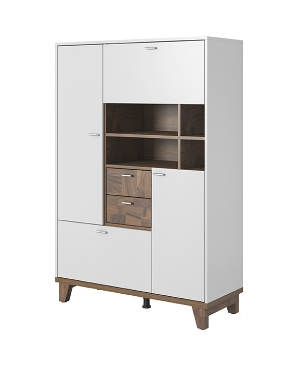 Odlično organizirana visoka vitrina OSLO vam nudi obilo manjših omaric, dva predala in štiri odprte police, zato lahko vanjo pospravite vse sorte predmetov in jih tudi dobro organizirate. Ponaša se s skandinavskim dizajnom, ki odlično izgleda v vsaki dnevni sobi ali jedilnici ter jo naredi bolj moderno!