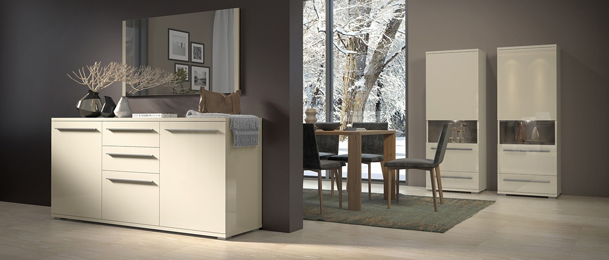 Elementi v visokem sijaju v vaš dom prinesejo pridih elegance in prefinjenosti. Elementi Radda Piano so na voljo v topli bež barvi v visokem sijaju, zato je vaš dom z njimi videti svetlejši in bolj čist. Kombinacija visokega sijaja s kromiranimi ročkami omogoči pohištvu moderni in elegantni videz, ki modernizira vsak prostor.