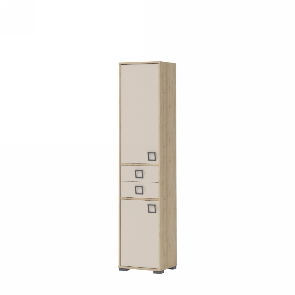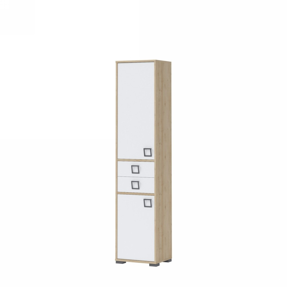Vitrina Kiki je na voljo v kar 4ih različnih kombinacijah zato lahko omaro popolnoma prilagodite svojim željam in potrebam, da se bo popolnoma ujemala z vašo otroško sobo. Je prostorna in dobro organizirana saj ima dva predala in dvoje vrat, za katerimi imate na zgornji strani dve polici, na spodnji pa še eno. Ima funkcijo tihega zapiranja. Vitrina je izdelana iz oplemenitene iverne plošče.