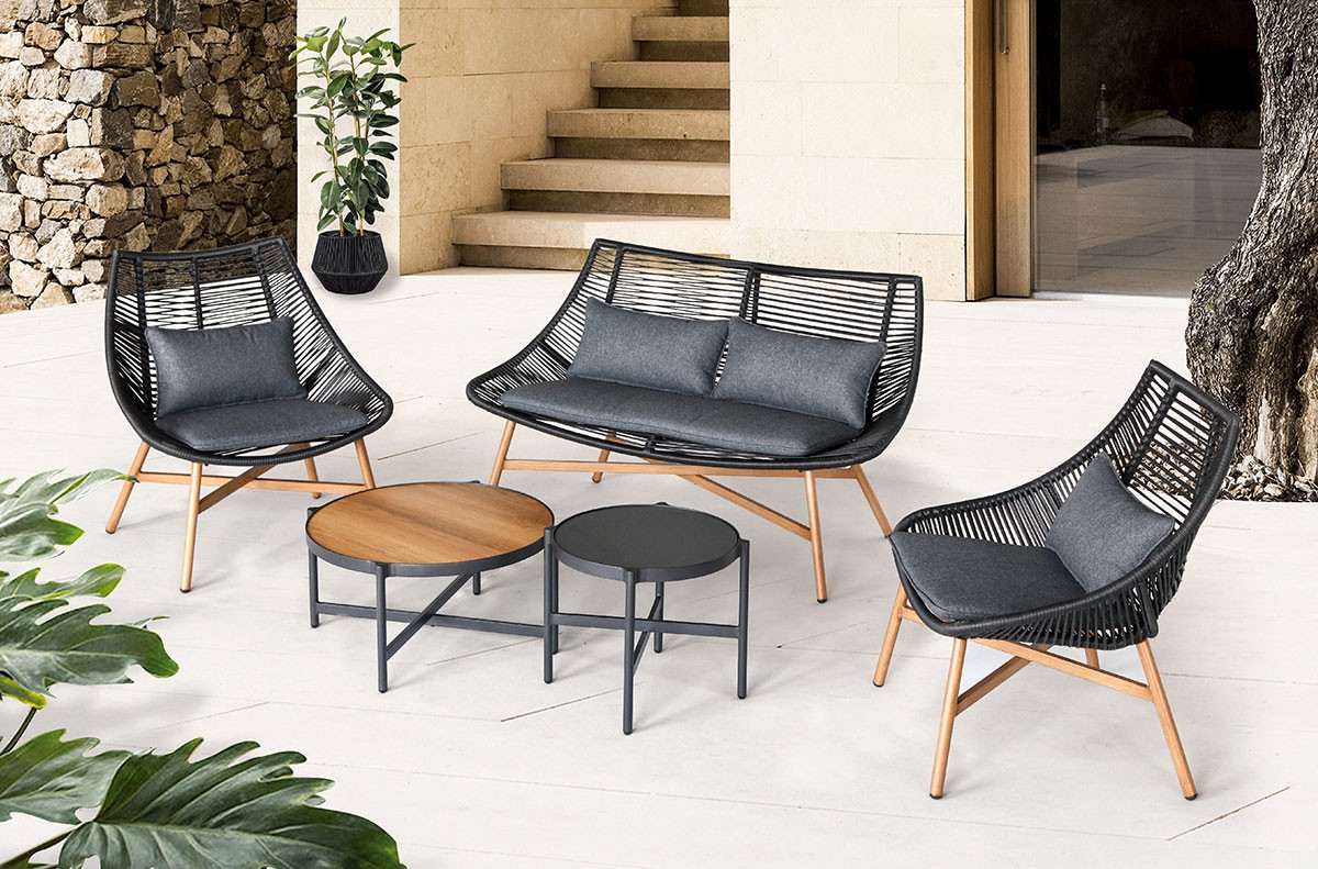 Prefinjen in moderen vrtni set HELSINKI 2 je odličen za druženje s prijatelji. Primeren je tudi za manjši vrt ali teraso. Na voljo je v črni barvi. Narejen je iz poliratana in aluminija. Ploskev mize je narejena iz stekla. Vključuje dva stola, dve mizici ter manjši vrtni kavč.