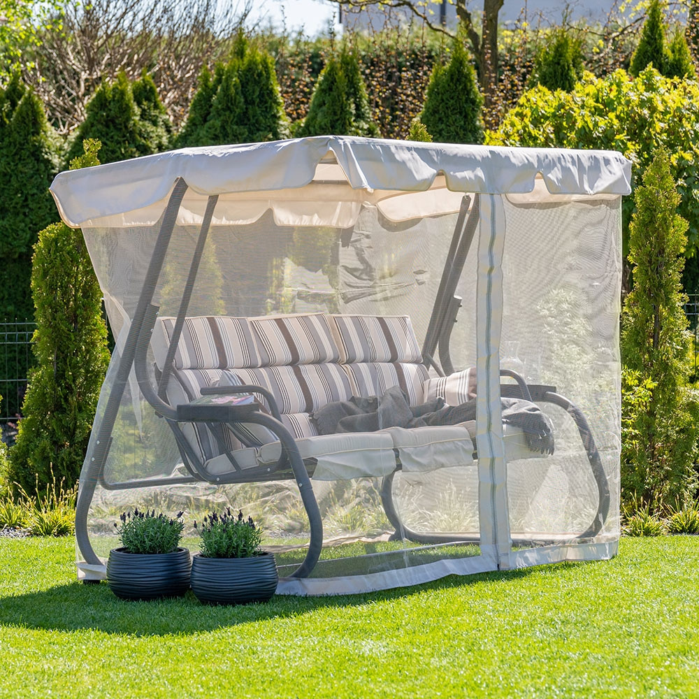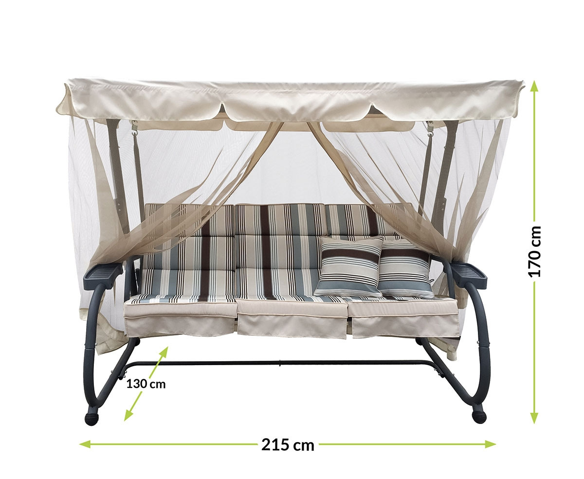 Opremite svoj vrt z udobno in kvalitetno vrtno gugalnico INES. Gugalnica ponuja sprostitev in druženje z vašimi najbližjimi. Glede na to, da je zunanje pohištvo, vsebuje tudi mrežo proti komarjem, da bo vaš počitek zares kvaliteten in nemoteč. Na voljo je v bež barvi, narejena pa je iz kovinskega ogrodja in tkanine v poliestru.