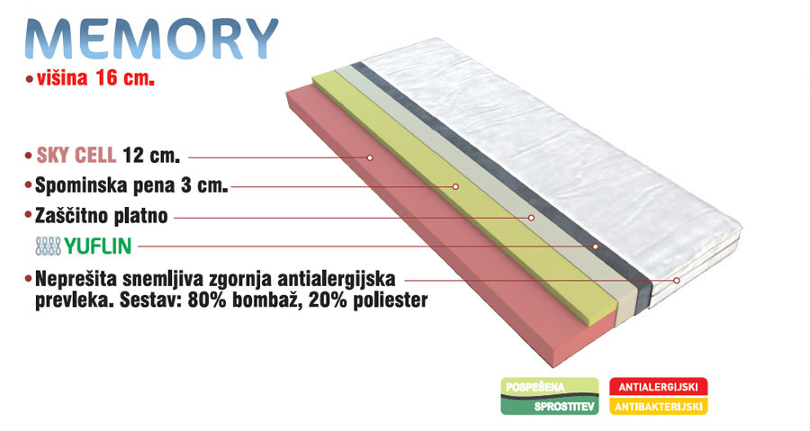Vzmetnica MEMORY je vzmetnica, ki je na voljo v različnih dimenzijah. Vzmetnica ima SKY CELL jedro obdano s spominsko peno (3 cm) ter antialergijsko prevleko.