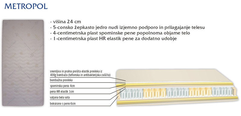 Vzmetnica METROPOL s 5 conskim vzmetenjem je izdelana iz kvalitetne spominske pene, zato se izjemno prilagaja vašemu telesu in vaši hrbtenici omogoča primerno lego. Vsebuje tudi HR peno in BOX, ki onemogoča udiranje in odpravlja občutek drsenja. Vzmetnica je zračna in enostavna za vzdrževanje.