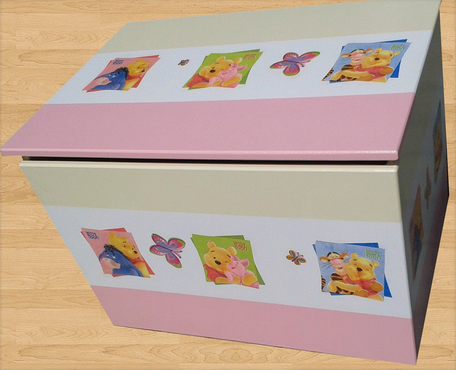 Zaboj za igrače Medvedek Pu (bež-roza) je unikaten zaboj za shranjevanje igrač, narejen s servietno tehniko z motivom pravljičnega junaka Medvedka Puja. Na voljo je nakup zaboja brez dodatkov, s pohištvenimi kolesi in/ali varovali za pokrov.
